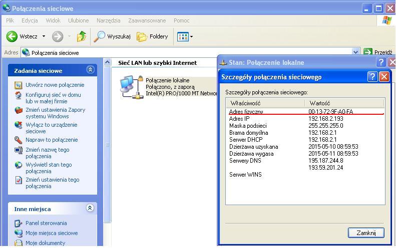 Każda karta sieciowa zawiera ma zapisany przez producenta unikalny adres fizyczny MAC (Media Access Control) wykorzystywany podczas transmisji w fizycznej wartswie modelu OSI.