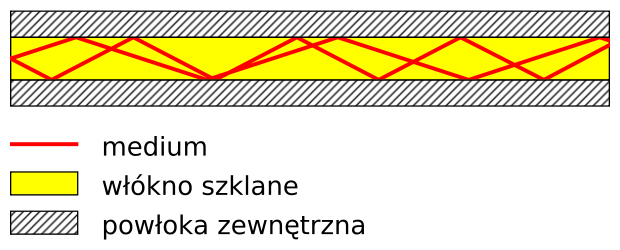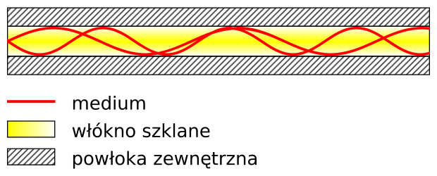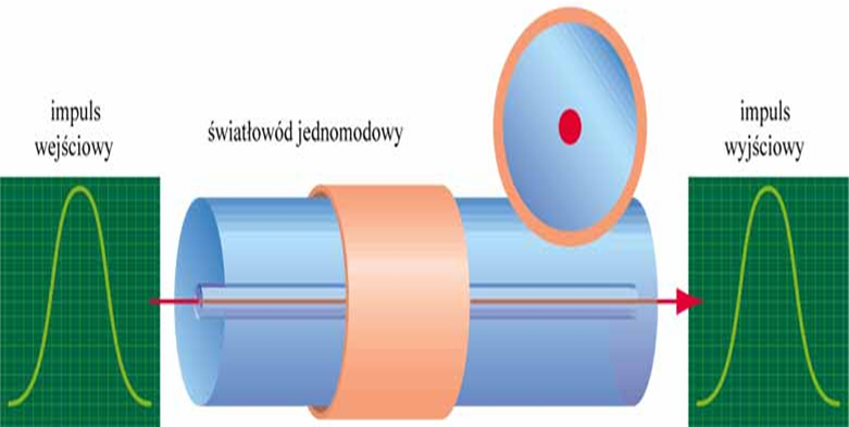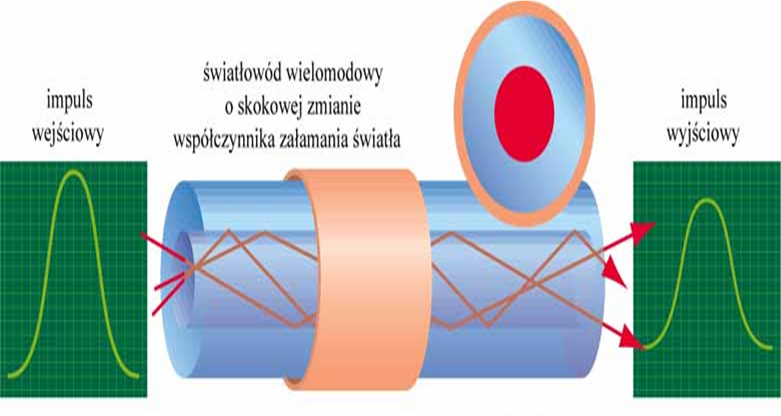 • w rdzeniu o średnicy 50-1000 mm ze względu na występowanie niekorzystnego zjawiska dyspersji, sygnał wejściowy ulega rozmyciu na wyjściu, a im dłuższy dystans ma światło do pokonania tym zaburzenie sygnału jest większe.