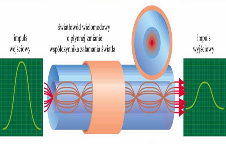 •Aby zminimalizować rozmycie impulsu wyjściowego, stosuje się czasem światłowody wielomodowe z gradientowym współczynnikiem załamania światła.